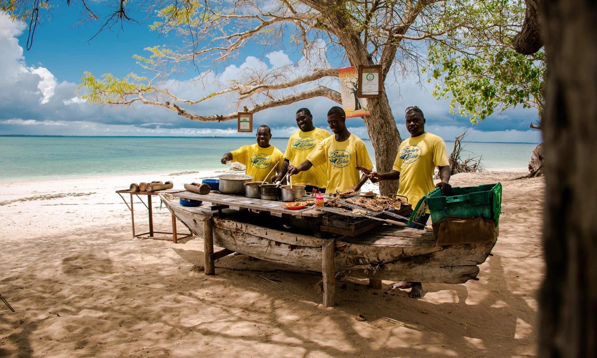 A full day excursion on tra¬ditional sailing dhows, Sa¬fari Blue starts from Fumba, the perfect starting point to explore Menai Bay, an official Conser¬vation Area. Home to beautiful uninhabited islands, the area is stunning, frequented by hump¬back and bottlenose dolphins. On arrival at Fumba, clients are given a briefing on Safari Blue and then you board your dhow and you’re off to explore the bay. Dolphins are sighted on approximately 90% of trips. Anchor is dropped at the Kwale sandbank, where sunshades are set up and guests have the chance to go snorkelling in the coral reefs, helped by the guides. After snorkelling, you’ll be of¬fered refreshments to whet your appetite before heading to Kwale Island, for lunch under the tam¬arind trees. Drinks are served throughout the day and lunch is a buffet of grilled fish, lobster, calamari, chicken and rice, with a tasting of tropical fruits.